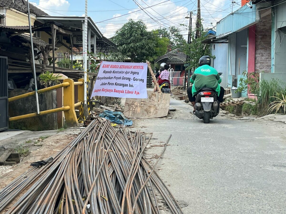 Warga pun akhirnya bersuara melalui spanduk besar yang dipasang di tepi jalan, bertuliskan tegas yaitu Kami warga Kenangan meminta kepada kontraktor agar segera menyelesaikan proyek gorong-gorong Jalan Poros Kenangan ini. Jangan kerjanya banyak libur aja.