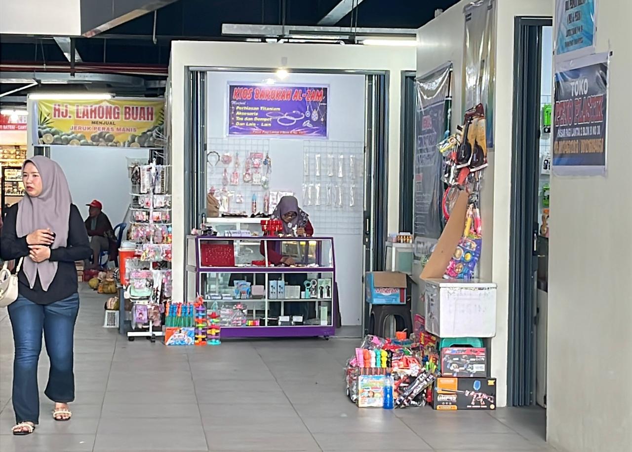 Salah satu pedagang, H. Iyan Saputra, pemilik Toko Rizquna yang menjual tas dan dompet, mengaku terpaksa membuka lapak di bawah tangga, di luar kios miliknya.