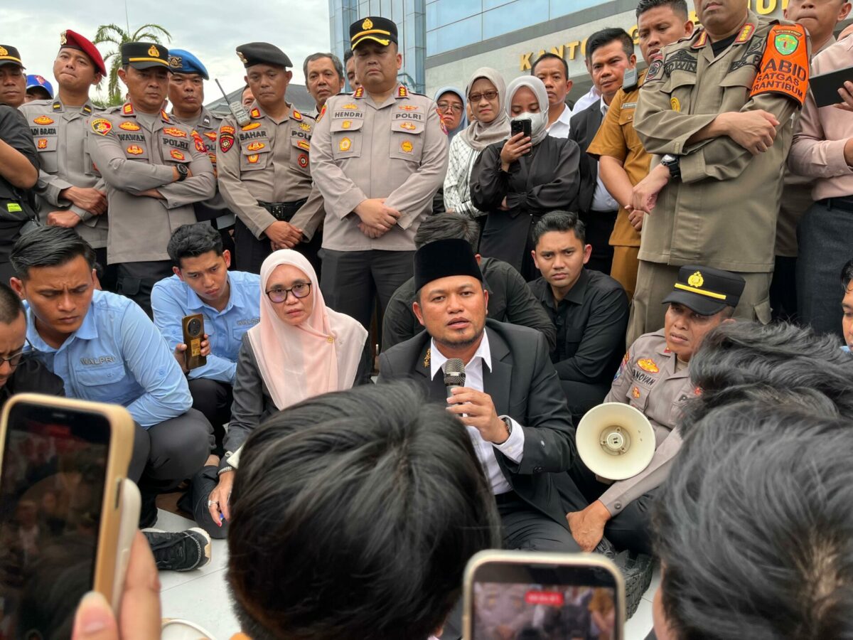 Gubernur Kaltim Rudy Mas'ud menyapa dan berdialog langsung dengan mahasiswa di tengah aksi unjuk rasa yang menyoroti evaluasi satu tahun kinerja Gubernur Kalimantan Timur. (Foto: Ree/Kaltimetam.id)