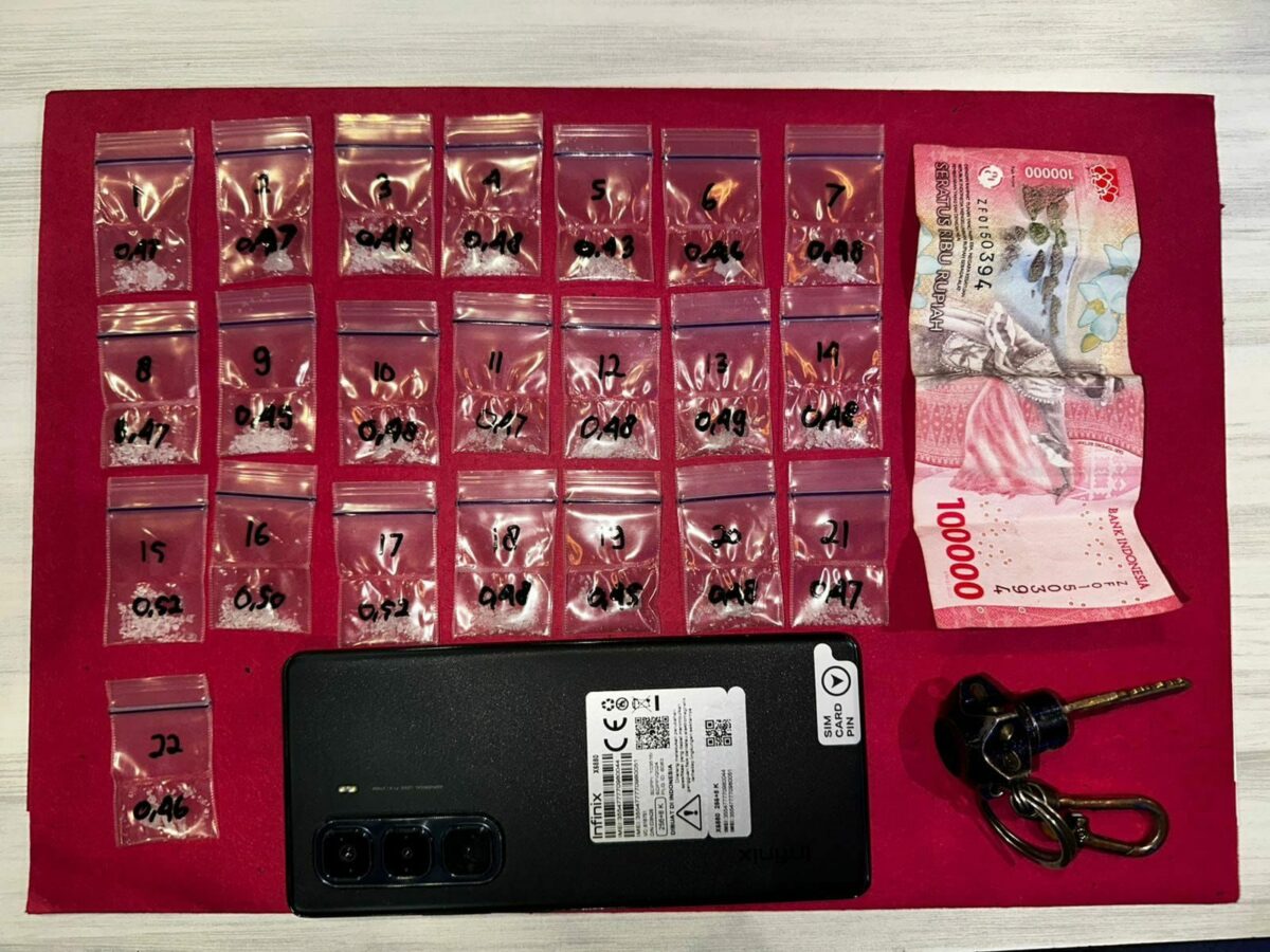 Sabu-sabu itu dibungkus rapi dalam plastik klip bening ukuran kecil dan disimpan dalam kantong hitam agar tidak mencolok. Selain barang bukti narkotika, polisi juga mengamankan satu unit telepon genggam Infinix warna hitam dan uang tunai Rp100 ribu yang diduga hasil penjualan sabu sebelumnya.