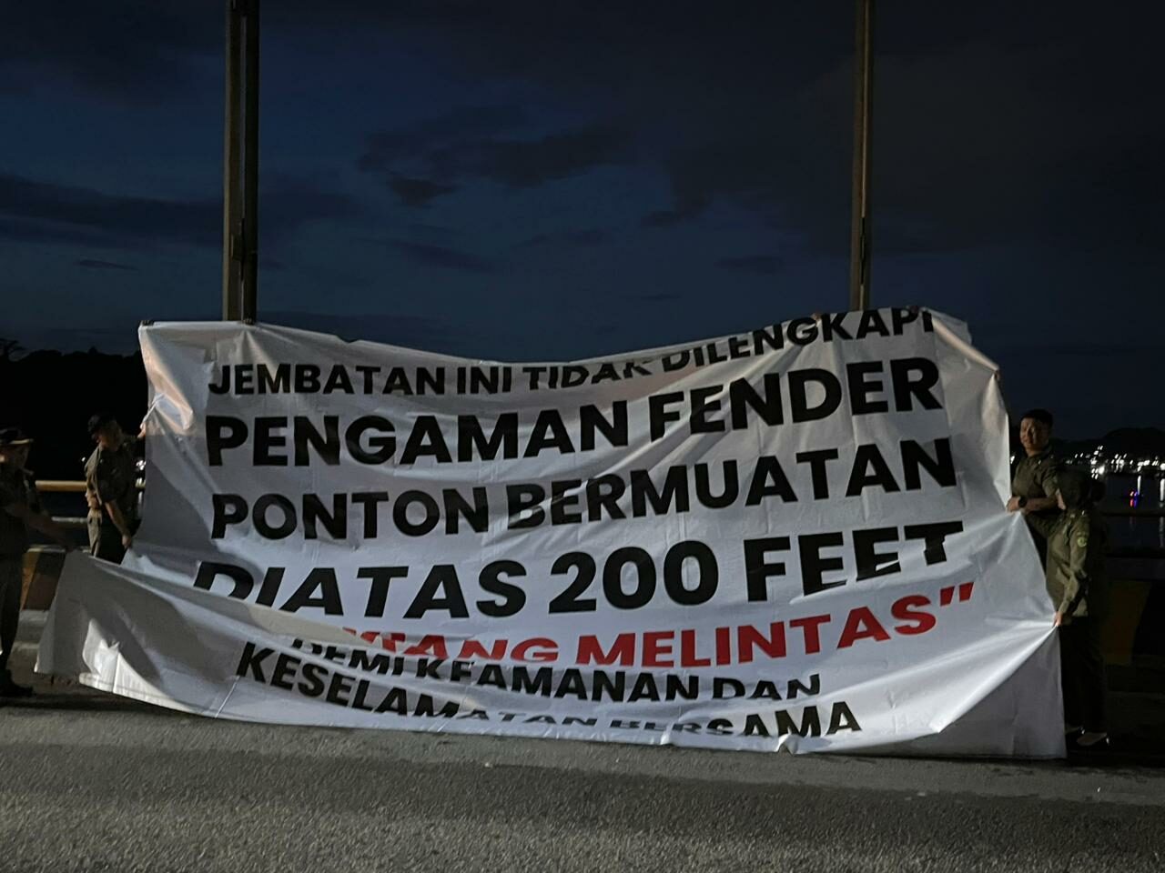 Pemasangan spanduk dilakukan Selasa malam (23/12/2025) di area pilar jembatan. Imbauan tersebut secara tegas melarang ponton bermuatan panjang di atas 200 feet melintas di bawah Jembatan Mahakam Ulu, mengingat jembatan tidak dilengkapi sistem pengaman fender.